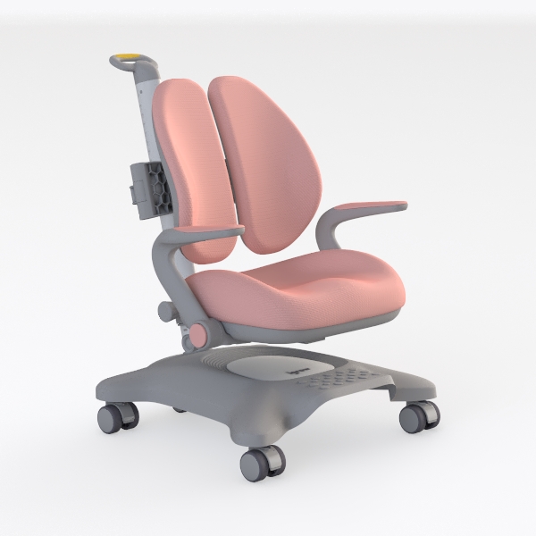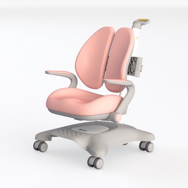 Designed with child-centric comfort in mind, this chair features soft pink mesh upholstery—breathable and gentle to the touch—paired with a sleek gray frame for a modern minimalist look. Its dual curved backrests offer ergonomic support, while smooth casters ensure easy movement, making it ideal for a cozy kids' study or bright home office, complementing wooden desks and warm lighting.