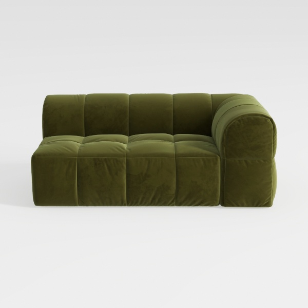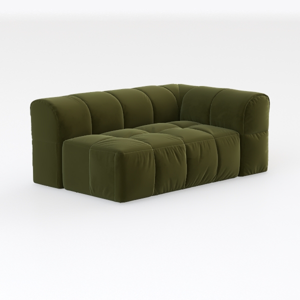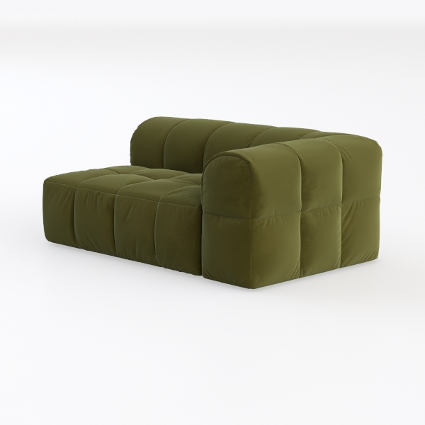 Crafted with a nod to mid-century modern geometry, the sofa blends architectural precision with organic warmth, drawing inspiration from the interplay of natural textures and structured forms. Its deep olive-green upholstery, rendered in a luxuriously velvety fabric, invites immediate tactile delight—its plush, slightly tufted surface yielding gently to the touch, while the cube-like arrangement of cushions creates a visually dynamic, sculptural silhouette that softens the eye.
