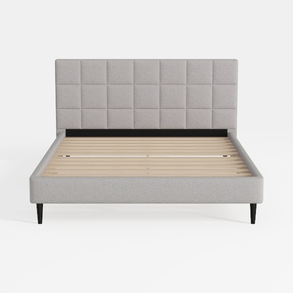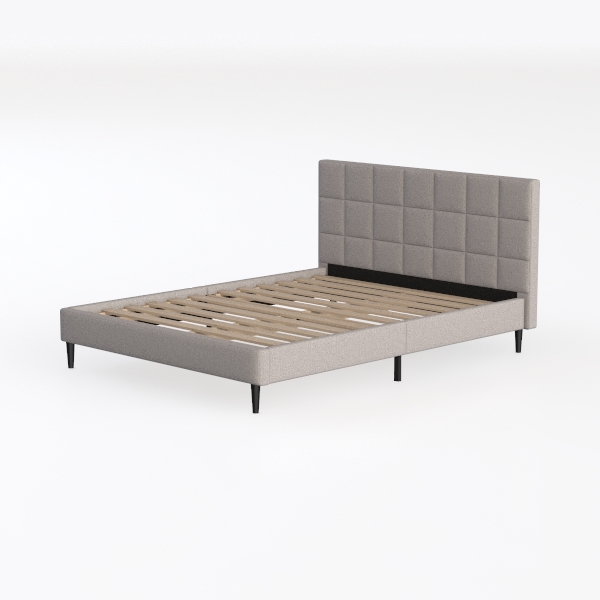 Inspired by minimalist geometric patterns, this bed features a soft, textured light gray fabric headboard with clean square tufting. The smooth, neutral tone and subtle texture create a calm, airy atmosphere, enhancing the room’s brightness. Ideal for modern Scandinavian or minimalist bedrooms, it pairs beautifully with wooden nightstands and sleek metal accents. Sturdy wooden slats provide reliable support, while the padded headboard offers gentle back comfort, ensuring a restful sleep space.