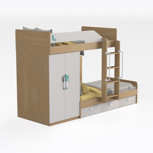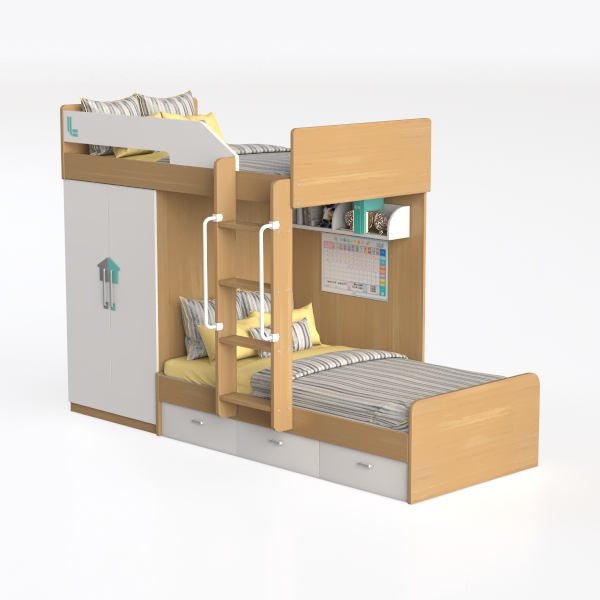 Designed for space-saving family living, this bunk bed blends warm wood tones with crisp whites. Soft, textured bedding in pale yellows and stripes contrasts gently with smooth cabinet surfaces, creating a cozy, inviting vibe. Perfect for a kid’s room or small home, it pairs with playful decor, while integrated drawers and a wardrobe offer ample storage, ensuring both style and functionality.