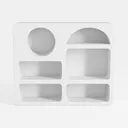 Inspired by minimalist design, this white storage unit blends smooth matte surfaces with geometric contours. Soft shadows highlight its clean, uncluttered look, perfect for modern or Scandinavian homes. Ideal for studies, living rooms, or bedrooms, it pairs well with wood/metal accents. Mixed circular, semicircular, and rectangular compartments offer versatile storage for small items, keeping spaces organized and tidy.
