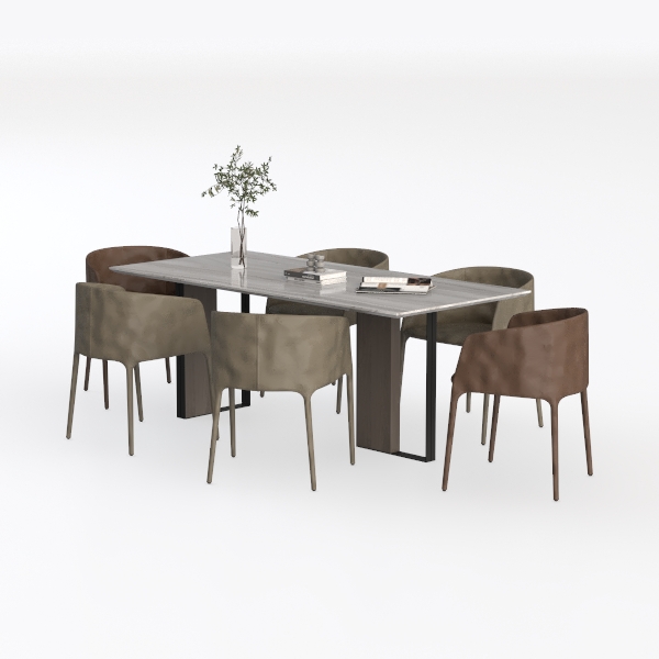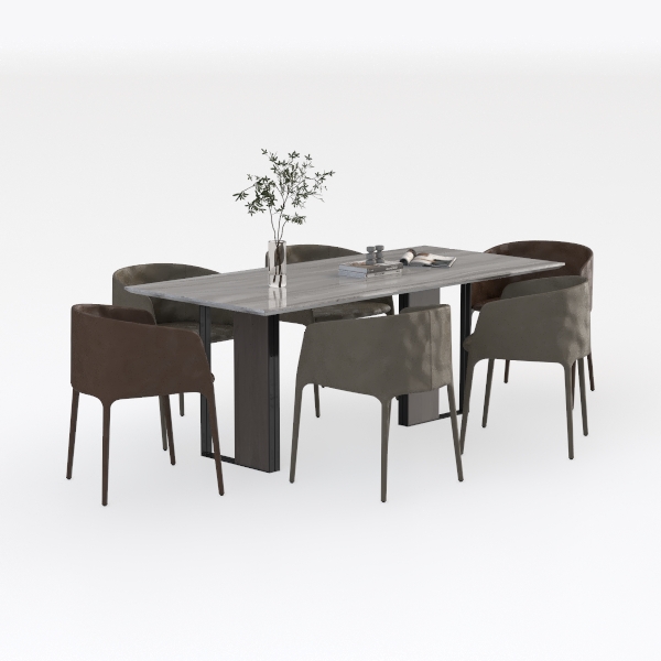 Designed with Scandinavian minimalism and warm modernity, this dining set blends sleek lines and soft textures. The marble tabletop shimmers with subtle veining, while chairs offer supple upholstery in taupe and brown. Ideal for modern-luxe dining rooms, it pairs with wooden accents and potted plants, enhancing serenity. Sturdy, space-efficient, and easy to clean, it balances style and practicality for family meals.
