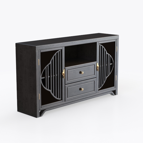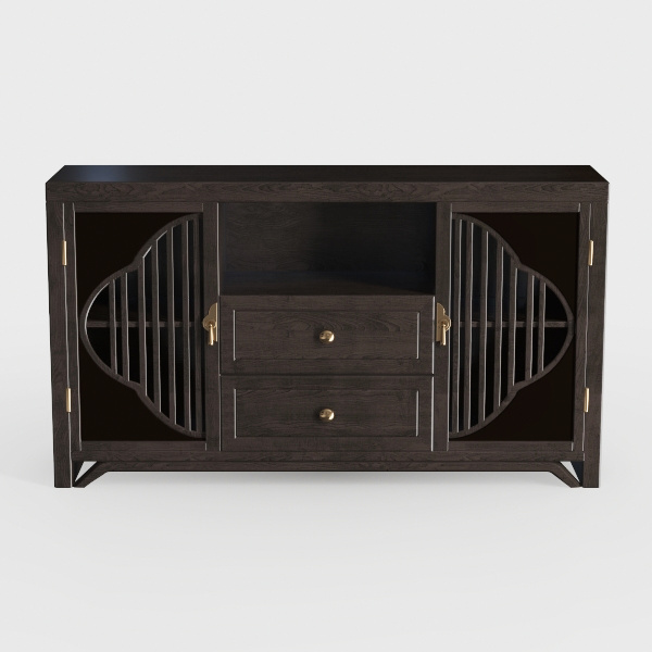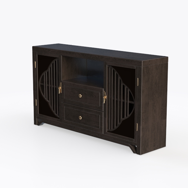Drawing inspiration from traditional oriental latticework, its curved lines blend classic elegance with modern minimalism. Crafted from rich, dark wood, its smooth surface exudes warmth, with matte finish and subtle grain adding depth. Ideal for a contemporary Chinese-inspired living room, it pairs beautifully with marble accents and soft textiles. Two drawers and open shelving behind lattice doors offer ample storage, balancing style and function.