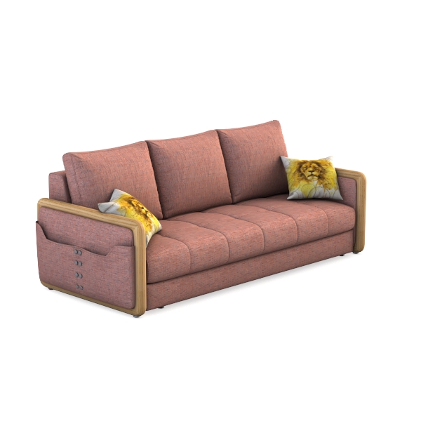 This sofa draws inspiration from the harmonious blend of natural warmth and contemporary simplicity, echoing the soft glow of a sunlit room and the organic charm of polished wood. The textured, linen-like fabric feels surprisingly gentle to the touch, its warm terracotta hue radiating coziness and softness, while the subtle weave adds depth to its visual appeal. Sleek, smooth wooden armrests—with their natural grain—complement the plushness of the cushions, creating a balanced mix of rustic and modern elegance, and the clean, uncluttered lines of the backrest and seat frame keep the design feeling light and unpretentious.