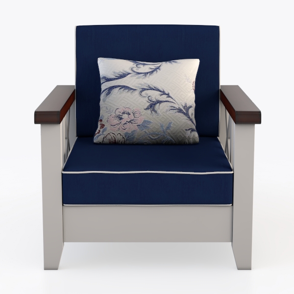 This armchair marries organic elegance with modern simplicity, drawing inspiration from the soft, flowing lines of natural vines and the timeless appeal of classic upholstery. The deep navy upholstery feels luxuriously plush, with a dense, supportive texture that craddles the body comfortably—its smooth surface yielding gently to the touch, while the warm brown wooden armrests add a tactile contrast, their polished finish cool yet inviting under the elbows. The light gray wooden frame, with its clean, angular legs, grounds the piece, creating a balanced silhouette, while the floral-patterned cushion—featuring delicate blue vines and soft pink blooms—adds subtle visual interest, enhancing the chair’s warm, approachable vibe.