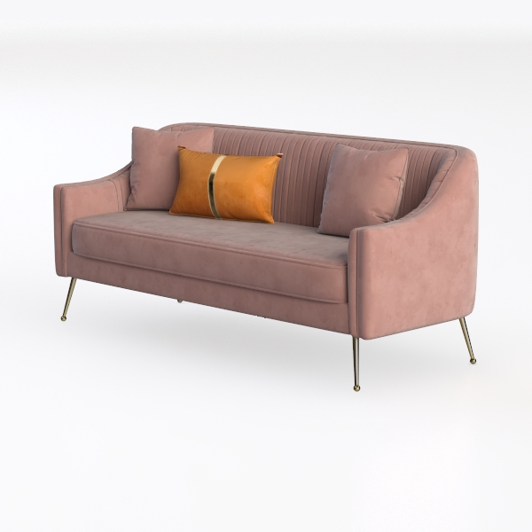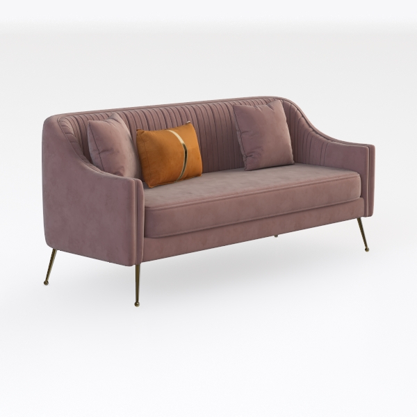 This sofa embodies a blend of soft, warm inspiration and modern elegance, drawing from the gentle gradients of dawn light and mid-century design principles. Its velvety blush-pink upholstery feels surprisingly tactile—smooth yet slightly plush, inviting fingers to sink into its texture. Vertical channel tufting along the back adds subtle depth, creating a rhythmic pattern that catches light softly, while the curved armrests frame the piece with a relaxed, approachable charm.