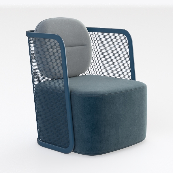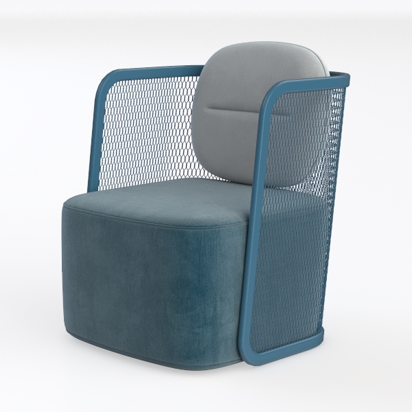 Visually, the piece feels calm and cohesive: the seat and backrest are upholstered in a soft, muted blue-gray fabric that catches light softly, while the frame—crafted from a delicate, open-weave material in a matching blue hue—adds airy transparency. This contrast of solid upholstery and lacy metal creates a sense of depth, making the chair feel both substantial and weightless.