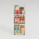 Designed for space efficiency, this metal grid rack draws inspiration from modern minimalist storage needs. Its sleek white metal surface, smooth to the touch, creates a light, airy vibe, blending seamlessly into kitchens or living rooms. Multiple tiers neatly organize snacks like KitKat, Jingle chips, and drinks, while rolling wheels ensure easy mobility, making it a practical, stylish addition to any cozy nook.