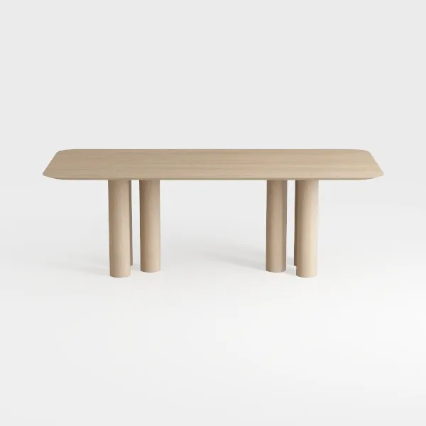 Crafted with a light, warm oak finish, the surface radiates a tactile allure—smooth to the touch, with subtle, natural wood grain patterns that catch light softly, casting delicate shadows that enhance its sculptural presence. The tabletop, slightly tapered at the edges, feels expansive yet airy, while the four cylindrical legs, with their soft, rounded bases, provide understated stability without overwhelming the space.