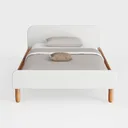 Inspired by warm, family-centric comfort, this bed blends simplicity with charm. Its smooth white frame and soft wooden legs contrast gently, while textured pillows and light-patterned bedding add a cozy, playful touch. Perfect for a serene kids' room, it pairs beautifully with pastel decor and soft lighting, and a spacious design ensures kids sleep and play comfortably, making it both practical and inviting.