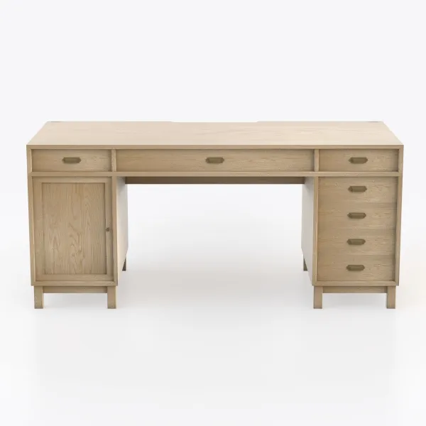 Crafted with natural wood grain, this desk draws inspiration from Scandinavian design, blending simplicity and functionality. Its warm, light finish and smooth surface offer a tactile comfort, while polished brass handles add subtle elegance. Perfect for a minimalist or Nordic-style study or bedroom, it pairs beautifully with a sleek chair and potted plants. With multiple drawers and cabinets, it provides ample storage, and the wide top suits work or study, ensuring both style and practicality.