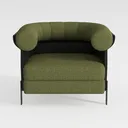 Inspired by organic curves and mid-century allure, this armchair blends textured olive-green upholstery—soft, tactile, and inviting—with sleek black metal legs and frame, creating striking contrast. Perfect for minimalist or Scandinavian living rooms, it pairs with wooden coffee tables and neutral rugs, offering a wide, padded seat for cozy relaxation.