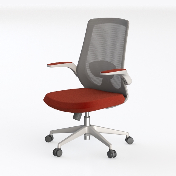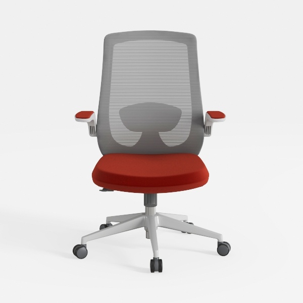 The backrest, crafted from a delicate, open-weave material, feels remarkably lightweight against the body, its fine texture allowing air to circulate freely, while the subtle ribbing provides soft, supportive contouring. Below, the seat is upholstered in a vibrant red fabric, its plush, high-density foam offering a satisfyingly soft yet resilient feel that invites hours of sitting. The contrast between the neutral gray of the backrest and the bold red of the seat creates a striking visual focal point, adding warmth and energy to the overall design.