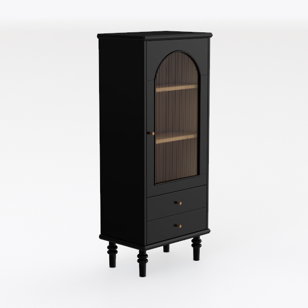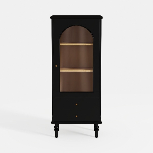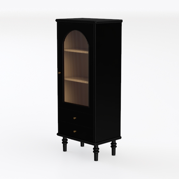 This elegant piece draws inspiration from the refined craftsmanship of vintage display cabinets, reimagined with clean, contemporary lines. Its deep black finish, achieved through a smooth, velvety paint, exudes a sense of understated luxury, while the gently curved top and tapered, turned legs nod to classic furniture design, adding a touch of timeless charm. The arched glass door, with its vertical ribbed pattern, filters light softly, creating a warm, diffused glow that highlights displayed items, making it both functional and visually striking.