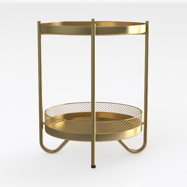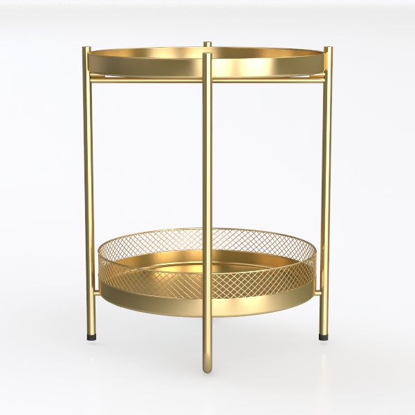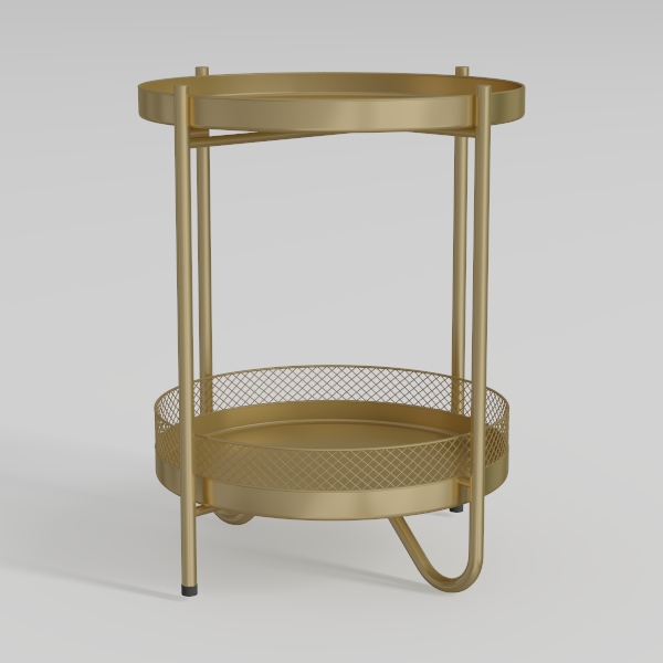 This elegant side table draws inspiration from mid-century modern design, merging geometric simplicity with warm metallic charm. Its upper surface, a smooth, matte gold metal tray, glows softly under ambient light, while the lower tier features an openwork mesh design—delicate, diamond-patterned cutouts that balance solidity with airy lightness. The slender, tapering metal legs, finished in the same rich gold, curve gently at the base, anchored by small black rubber feet that add subtle contrast and ensure stability.