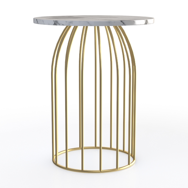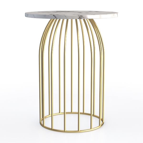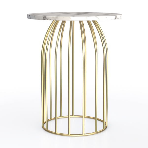 This elegant side table merges contemporary design with subtle sophistication, taking cues from architectural minimalism and organic fluidity. The base features a delicate, cage-like framework crafted from polished gold-toned metal—sleek, evenly spaced rods curve gently upward, creating an airy, open structure that feels both light and sturdy. The top, a smooth circular slab of marble, shimmers with soft white and gray veining, its natural texture adding warmth and a touch of luxury that contrasts beautifully with the cool metallic base.