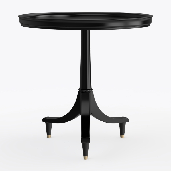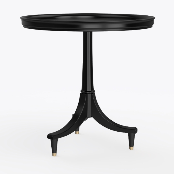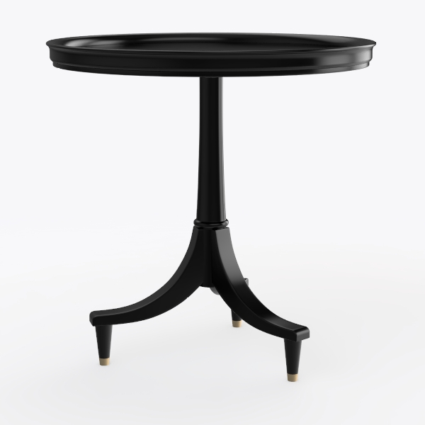 Visually, its matte black finish exudes understated sophistication—smooth to the touch, with a subtle sheen that catches light gently without overwhelming. The tabletop, perfectly rounded, offers a warm, inviting surface, while the pedestal base narrows gracefully before flaring into three tapering legs, each capped with a tiny brass foot that adds a hint of opulence. The contrast of the deep black against the brass accents creates a striking yet harmonious look, making it a focal point without demanding attention.