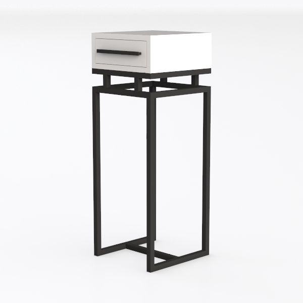 The top surface features a smooth, matte white finish that catches light softly, while the slender black metal frame—with geometric crossbracing at the base—adds subtle industrial charm, balancing the warmth of the white with the coolness of the metal. The tactile experience is refined: the drawer front, slightly raised for easy grip, opens with a quiet, smooth glide, revealing a small, handy interior perfect for tucking away remotes, jewelry, or small decor.