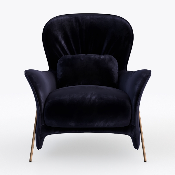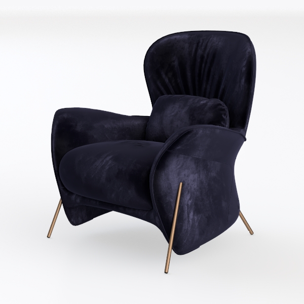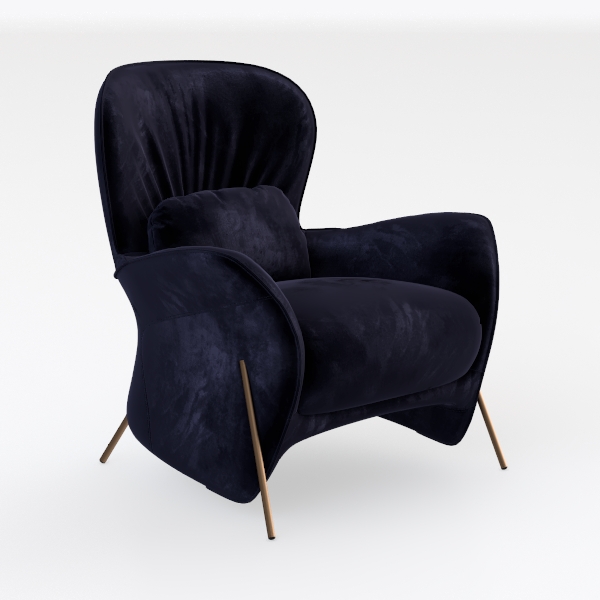 Inspired by the fluid lines of mid-century modern design and the refined opulence of contemporary interiors, this armchair embodies a perfect blend of nostalgia and modernity. Crafted from sumptuous velvet in a rich, deep indigo hue, its surface feels incredibly soft to the touch—plush and slightly matte, with a subtle pile that catches light gently, casting delicate shadows that enhance its organic, curved silhouette. The slim, gold-tone metal legs provide a striking contrast, adding a touch of understated glamour while ensuring stability.