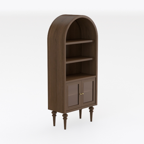 The elegant silhouette features an arched top, curving gracefully to frame three open shelves—ideal for displaying cherished books, potted succulents, or vintage decor—while the lower section is anchored by two glass-front cabinets, their transparent doors allowing a glimpse of neatly stored items and complemented by small, polished brass handles that add a touch of understated luxury.