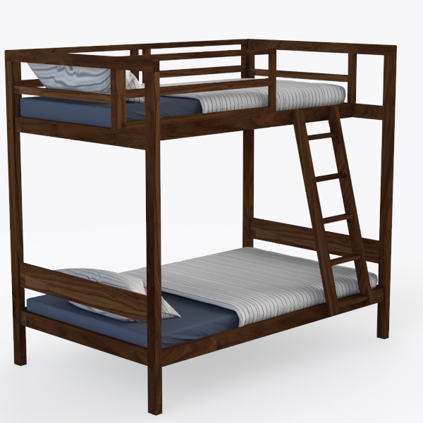 The frame, crafted from solid wood, showcases a rich, warm brown hue with visible, natural wood grain patterns that add texture and depth. The smooth, sanded surface feels cool yet inviting to the touch, while the vertical lines of the headboard and footboard, paired with the sturdy, gently sloped ladder, create a structured yet approachable silhouette. The overall look is understated, allowing it to blend seamlessly with various decor styles.