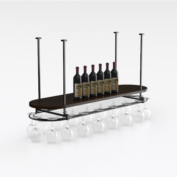 Rooted in the timeless allure of classic wine storage, this piece merges heritage charm with contemporary minimalism. The main shelf, crafted from rich, warm wood, features smooth, polished surfaces that highlight its natural grain, while the supporting frame, made of matte black metal, adds an industrial edge with clean, straight lines. The contrast between the wood’s organic warmth and the metal’s sleek coolness creates a balanced, sophisticated look, with the transparent wine glasses hanging below adding a light, airy touch that prevents clutter.
