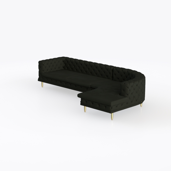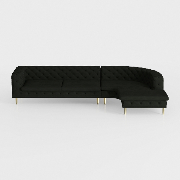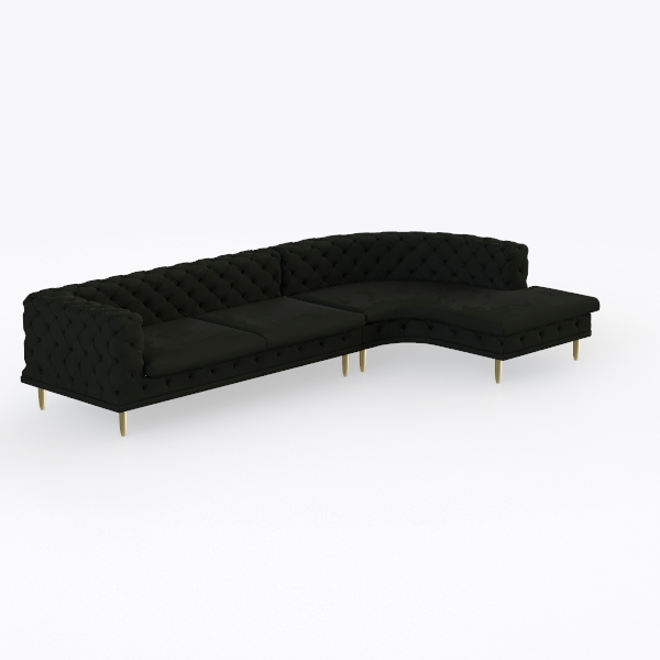 Introducing a sophisticated sectional sofa that redefines modern elegance and comfort. The design draws inspiration from timeless luxury, featuring plush upholstery and a tufted detailing that adds a touch of refinement. The soft fabric emanates a tactile experience, inviting you to sink into its embrace, while the sleek gold legs provide a striking contrast and stability.