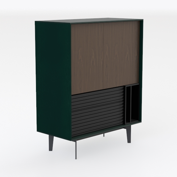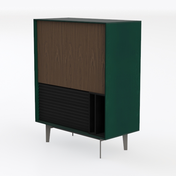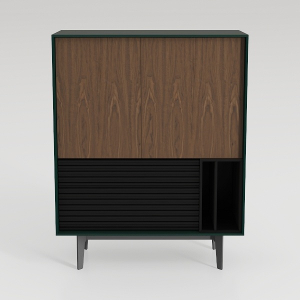 This elegant piece of furniture draws inspiration from the seamless blend of organic warmth and contemporary minimalism, merging the richness of natural materials with geometric precision. The upper section features a striking expanse of walnut wood, its smooth, visible grain patterns creating a tactile connection to nature—running fingers over its surface reveals a warm, slightly textured finish that softens the modern silhouette. Below, a sleek black slatted panel adds a bold, linear contrast; its matte texture catches light subtly, casting gentle shadows that enhance the cabinet’s depth, while the deep green frame, finished in a velvety matte paint, acts as a sophisticated border, tying the warm wood and black elements into a cohesive, balanced whole.