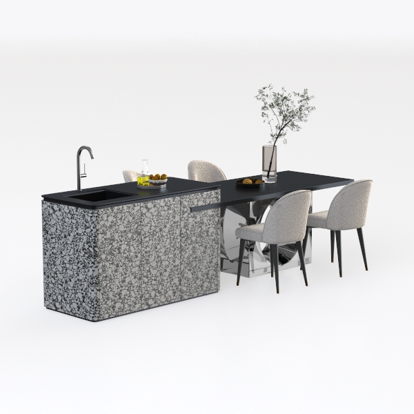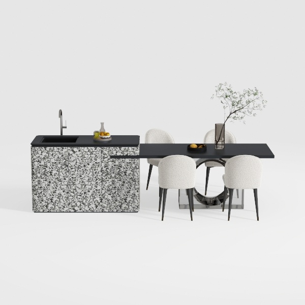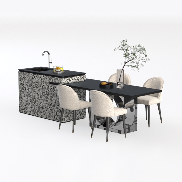 Drawing inspiration from the interplay of natural stone patterns and minimalist geometric forms, this kitchen-dining ensemble blends organic texture with clean lines. The countertop features a striking black-and-white speckled surface, its matte finish offering a tactile contrast between smooth and subtle granularity, while the sleek black tabletop provides a sharp, uncluttered base. The four dining chairs, upholstered in soft off-white fabric with slender black legs, add a warm, inviting touch, their curved silhouettes balancing the angularity of the table and counter.