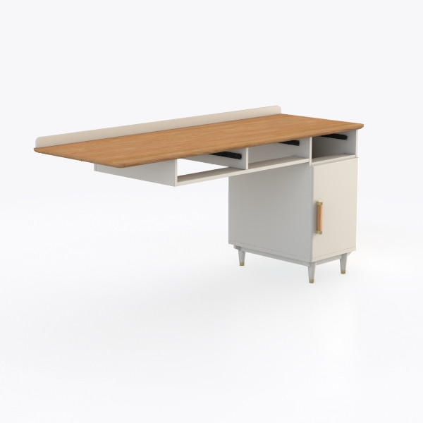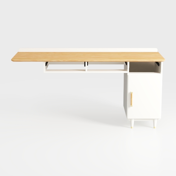 The design takes cues from mid-century modern aesthetics, prioritizing clean lines and functional elegance. A warm, natural wood grain on the expansive tabletop delivers a tactile, organic contrast to the smooth, matte white cabinetry, while the slender, tapering legs in the same crisp white hue add a light, airy presence. A subtle gold handle on the cabinet front introduces a soft metallic accent, balancing the simplicity of the piece with delicate sophistication.