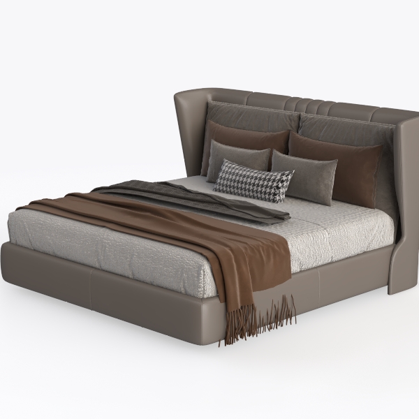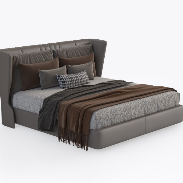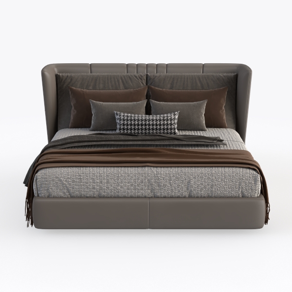This piece draws inspiration from the harmonious fusion of modern simplicity and understated luxury, aiming to craft a bedroom focal point that feels both contemporary and inviting. The headboard, with its soft, smooth leather surface, curves gently to cradle the body, while its warm gray tone exudes a sense of calm, making it a versatile backdrop for any decor style. The textured gray bedspread, woven with subtle patterns, contrasts beautifully with the leather’s sleek finish, creating a balanced visual rhythm that catches the eye without overwhelming the space.