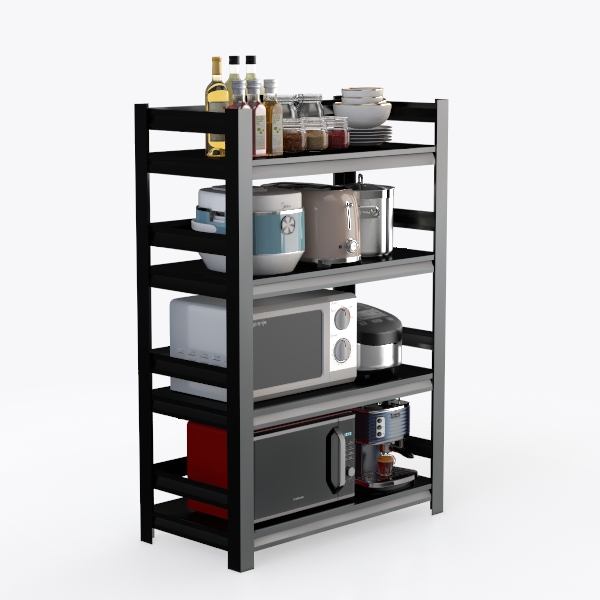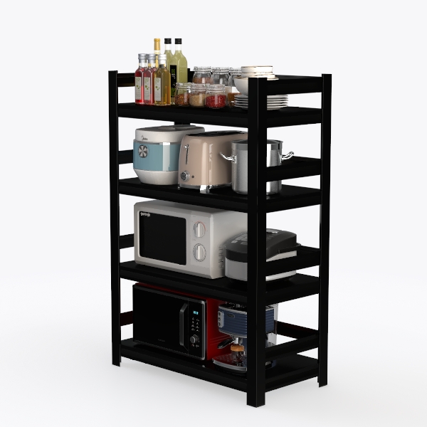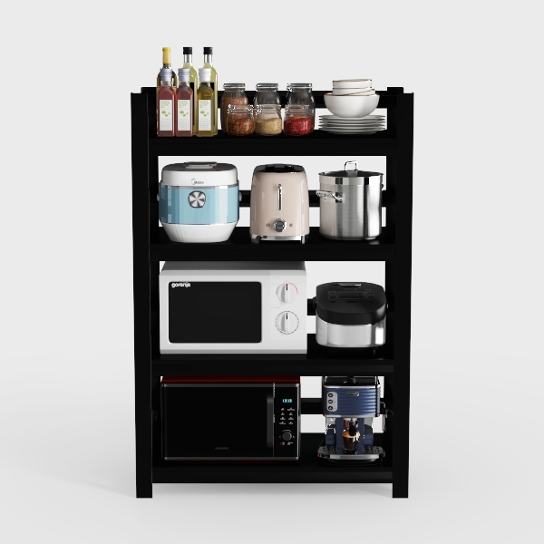 Crafted with a smooth black frame, its clean, geometric lines and matte finish radiate minimalist sophistication. The sturdy, load-bearing design ensures it can easily hold the weight of daily kitchen items, while the even spacing between shelves adds a balanced, intentional look. The contrast between the dark base and the vibrant, varied hues of the items atop—soft pastels of the rice cooker, the warm metallics of the pot, and the crisp whites of bowls—creates a visually engaging rhythm, making even the most ordinary tools feel thoughtfully curated.