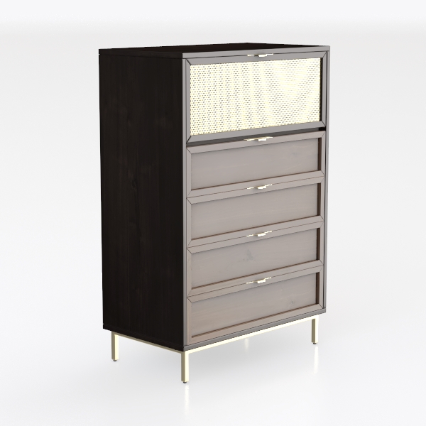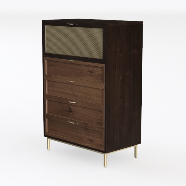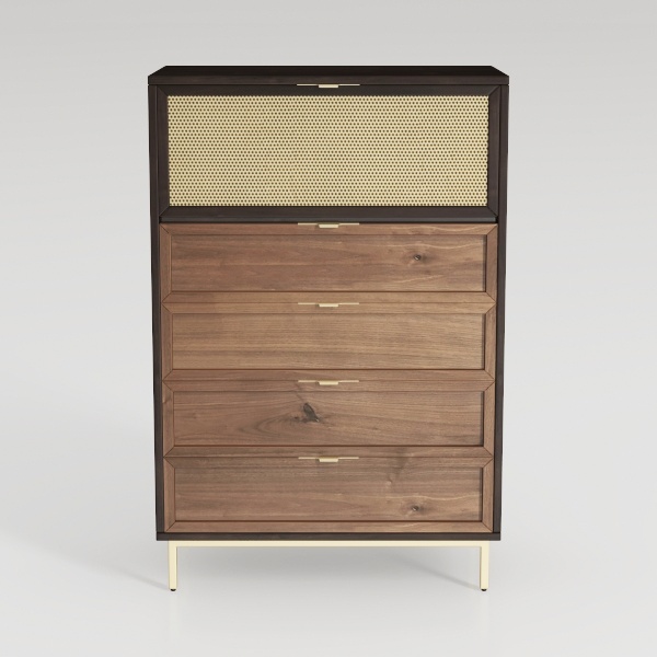Inspired by mid-century modern design, this cabinet blends classic simplicity with contemporary flair. Crafted from rich, warm wood, its frame features a smooth, sanded finish that feels inviting to the touch, while the light-toned drawers reveal natural grain patterns, adding organic texture. A woven panel on top introduces airy contrast, softening the solidity of the wood, and slender gold metal legs elevate the structure, infusing subtle luxury.