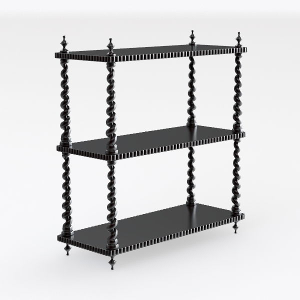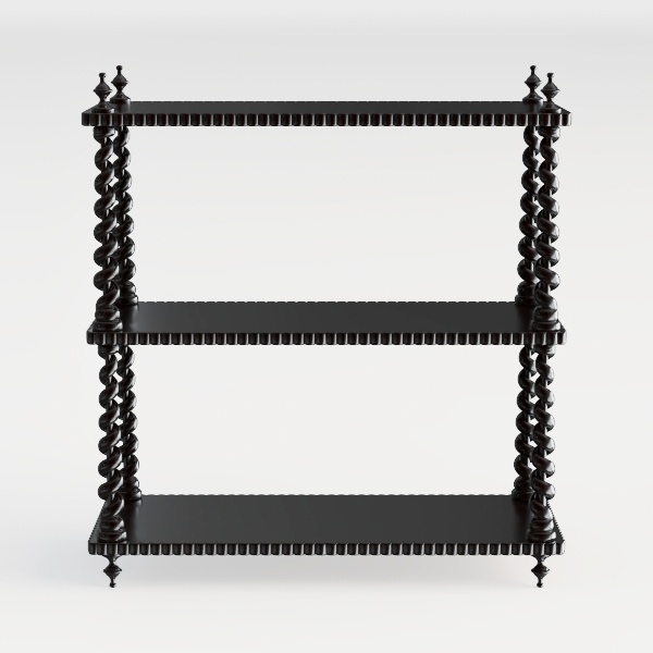 Crafted with a smooth, matte black finish, the surface feels warm and tactile—cool to the touch yet inviting, while the deep hue exudes a sense of understated sophistication. The spiral-shaped supports, with their intricate, twisting grain patterns, add dynamic texture; each curve and twist catches light softly, creating subtle shadows that enhance the shelf’s depth. The fluted edges of the shelves and the pointed finial feet, both delicate and intentional, balance ornate charm with a streamlined presence.