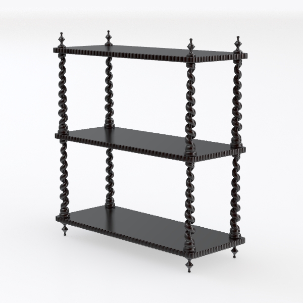 This elegant three-tiered shelf, with its striking silhouette and refined details, draws inspiration from 19th-century woodworking traditions, reimagined for contemporary spaces. The design marries classic artistry with modern practicality, evident in its symmetrical structure and thoughtful proportions.