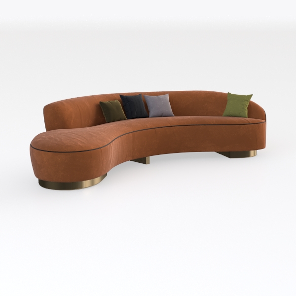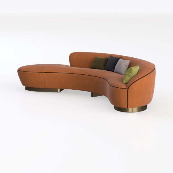 This stunning sofa design draws inspiration from modern minimalism blended with organic forms, making it a standout piece for any contemporary living space. Wrapped in soft, tactile fabric, its warm orange hue exudes a sense of warmth and comfort, inviting you to sink in and relax. The gentle curves create a harmonious flow, while the sleek, gold base adds a touch of sophistication.