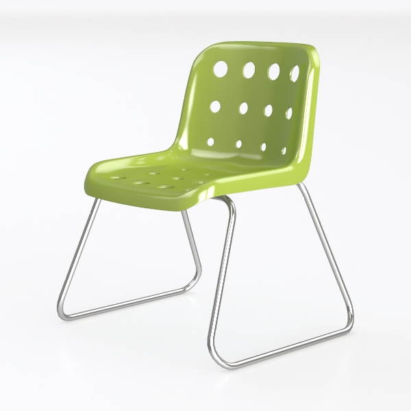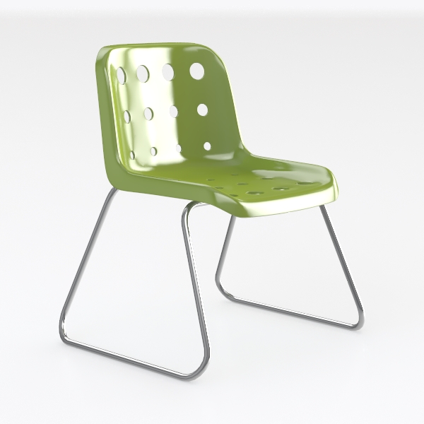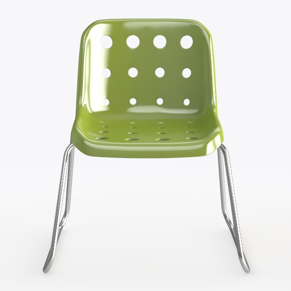 Visually striking, the chair features a vibrant sage green body that catches light subtly, while circular cutouts in the backrest and seat add a rhythmic pattern of shadow and light—balancing visual interest with an airy, uncluttered feel. Crafted from smooth, high-quality plastic, the surface is cool and slightly matte to the touch, offering a refreshing contrast to the sleek, polished silver metal legs that provide sturdy support with an exceptionally lightweight presence.