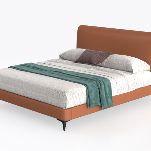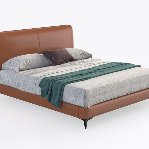This piece draws inspiration from the seamless blend of organic warmth and contemporary minimalism, creating a bedroom focal point that balances comfort and sophistication. The headboard and footboard feature a rich, warm brown leather—its smooth, cool surface contrasts beautifully with the soft, textured gray bed linens below, while a casually draped teal throw blanket adds a subtle, earthy pop of color. Clean, unadorned lines and a low-profile silhouette keep the design airy, making the space feel both open and inviting.