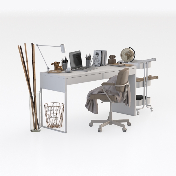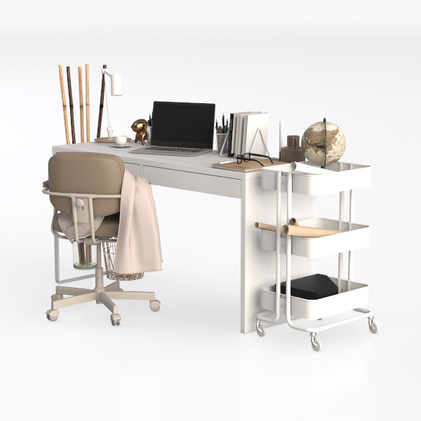This curated home workspace merges minimalist design with organic warmth, drawing inspiration from the quiet balance of geometric simplicity and natural elements. At its core is a slender, matte-white desk with a smooth, unpolished surface that reflects soft light, creating an airy, uncluttered atmosphere. Complementing it is a plush beige office chair, upholstered in a textured fabric that feels cool yet inviting, with a sturdy metal frame and swivel casters for effortless mobility—ideal for adjusting height or repositioning to suit any task.