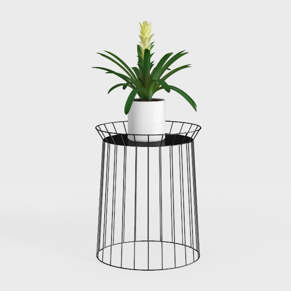 Visually, the piece exudes a cool, contemporary vibe, with the metal’s subtle sheen catching ambient light to create soft reflections. The texture of the frame is smooth to the touch, with a slightly cold, metallic feel that complements the warmth of natural elements. When paired with a lush potted plant—its long, vibrant green leaves and delicate yellow bloom—the contrast between the rigid, geometric metal and the flowing, living foliage adds dynamic balance, infusing the space with a touch of life and softness.