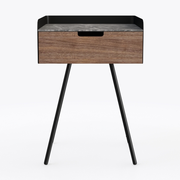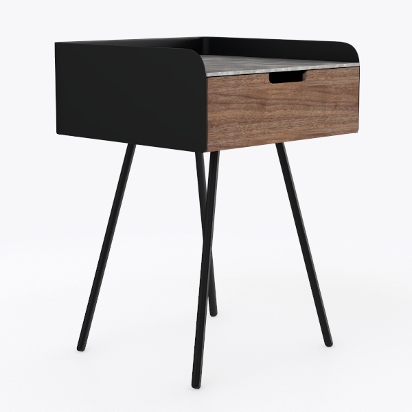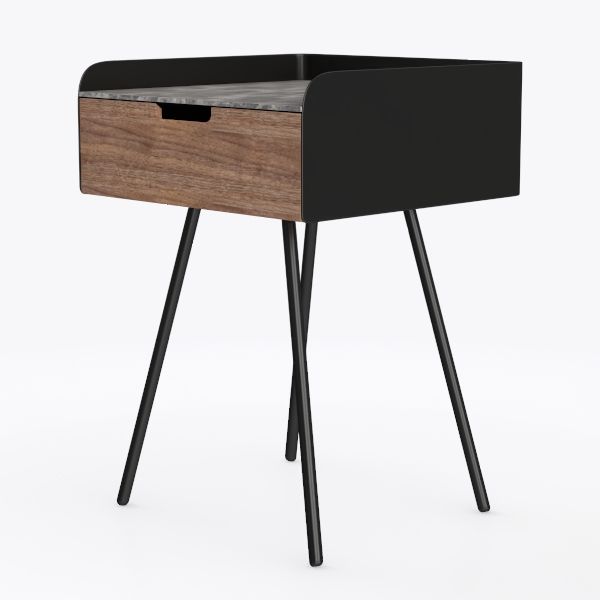 Crafted with a blend of organic warmth and geometric precision, this piece draws inspiration from balancing natural textures and industrial minimalism. The drawer front features rich, grainy wood with a soft, tactile surface—its warm, earthy tones grounding the design—while the matte black metal top adds a cool, contemporary contrast, catching light subtly. Slender black metal legs, tapering to a point, elevate the piece, creating a sense of轻盈 and stability, as if floating gently above the floor. Visually, it strikes harmony: wood’s organic softness and metal’s sharp edge merge to feel both timeless and fresh.