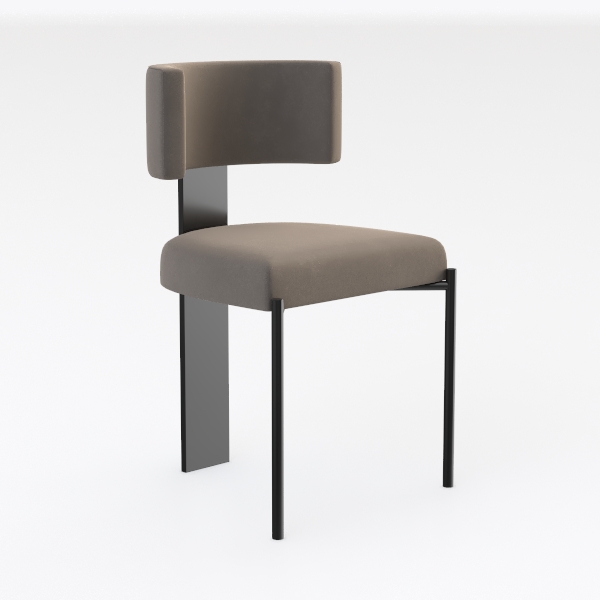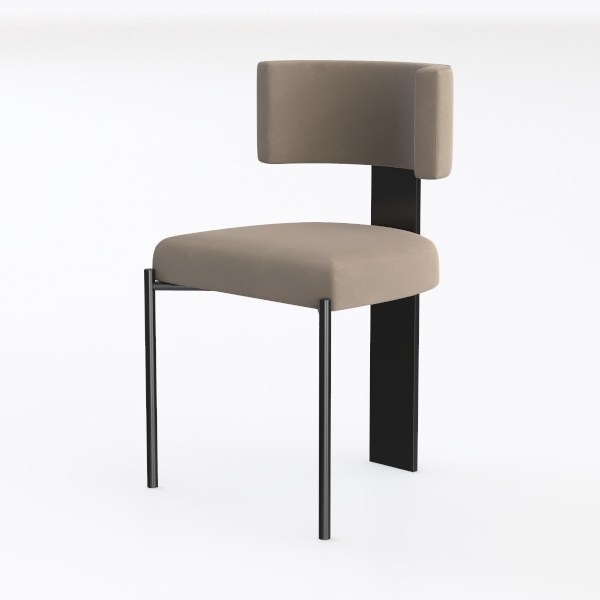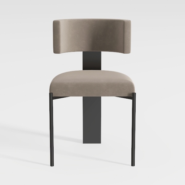 This elegant piece draws inspiration from the harmony of natural softness and geometric precision, balancing organic curves with sharp, architectural lines. The seat and backrest feature a soft, velvety taupe fabric that feels warm and inviting to the touch, its neutral hue creating a calming effect that complements any space. The sleek black metal frame, with its slim, tapering legs, adds a modern edge, while the continuous vertical support between the back and seat reinforces the design’s stability and visual flow. Its minimalist aesthetic makes it a versatile choice—ideal for a modern dining room, where it pairs beautifully with a light wooden table and marble accents, or in a minimalist living area alongside a low-profile sofa and metallic pendant lights. The slightly curved backrest offers gentle lumbar support, and the plush upholstery ensures hours of comfortable seating, making it both a functional and stylish addition to contemporary homes.