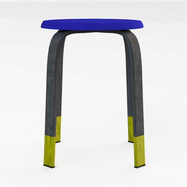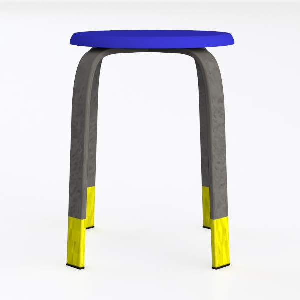 The seat, a smooth, matte blue surface, feels cool and tactile, inviting brief or extended use without sacrificing comfort; its round shape conforms gently to the body, while the material’s subtle sheen adds a touch of softness against the harder elements below. The frame, executed in a muted gray metal, features gracefully curved legs that arch inward from the seat, creating a sense of lightness despite its sturdy construction. These legs terminate in small, blocky yellow bases—bright, unexpected accents that anchor the piece and add a playful pop of color, turning a simple stool into a statement object.