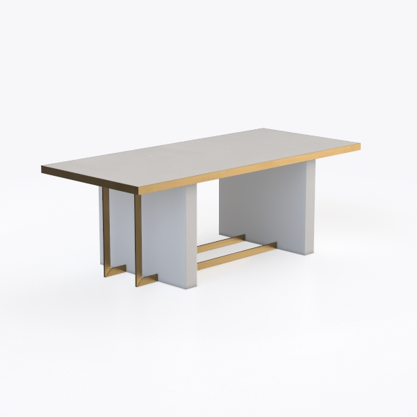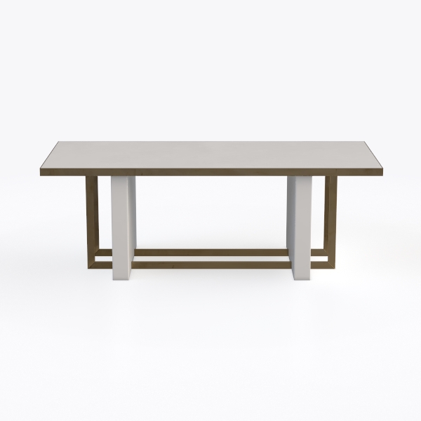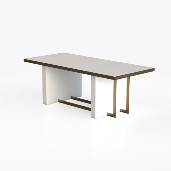 The base, crafted from a blend of brushed brass and matte white metal, forms a slim, open H-shape, with vertical supports that taper subtly toward the base. This design balances lightness and stability: the frame feels airy enough to not overwhelm the space, while the thick, solid tabletop ensures it can easily accommodate dining essentials, a laptop, or a display of potted plants.