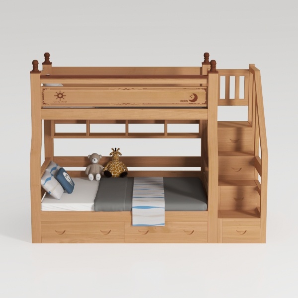 The light, natural wood finish highlights soft, smooth grain patterns, inviting gentle touches and evoking the warmth of sunlit afternoons. Rounded edges and a sturdy frame ensure safety, while the high guardrails on the upper bunk add a reassuring sense of security, letting little ones sleep soundly. Subtle sun and moon motifs on the headboard infuse the piece with whimsy, balancing the understated structure with a touch of magic.