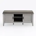 Beyond its aesthetic allure, the louvered doors open to reveal a generous interior, perfect for stashing media devices, blankets, or seasonal items. The padded top, meanwhile, invites relaxation—ideal for kicking back with a book or using as extra seating for guests. This piece seamlessly blends style and practicality, making it a standout addition to any home.