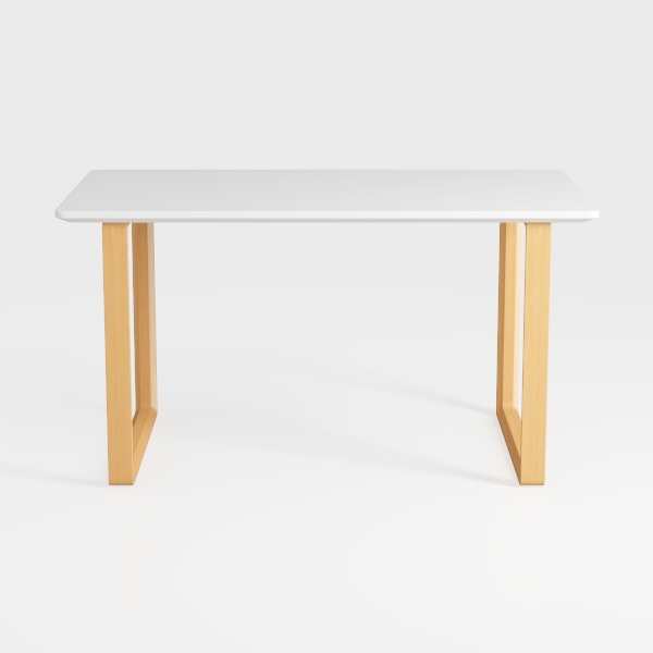 Drawing inspiration from Scandinavian design philosophy, this piece merges minimalism with organic charm, focusing on clean lines and balanced proportions. The tabletop, crafted from a smooth, matte white material, feels cool and tactile to the touch, while its large, flat surface offers a crisp, uncluttered canvas for daily use. The legs, made from light oak wood, feature a warm, grainy texture that contrasts gently with the sleek top, adding a natural, earthy element to the overall aesthetic. Visually, the U-shaped leg design creates an airy, open feel, making it appear lightweight despite its stability, which is enhanced by the sturdy wooden structure.