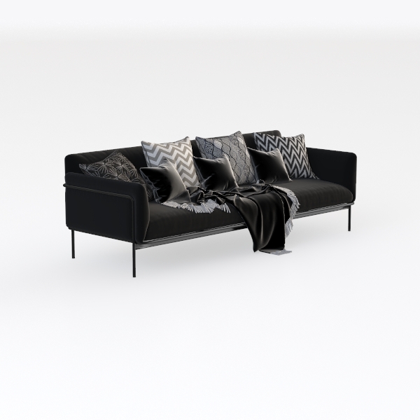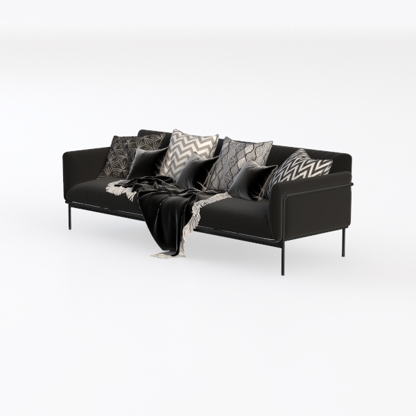 Visually, the sofa exudes calm sophistication. The black fabric, with its velvety sheen, catches light gently, while the slim, black metal legs elevate it slightly, making the space feel airy and uncluttered. The varied textures of the pillows—some smooth, others with subtle embossed details—complement the softness of the throw, creating a multi-sensory experience.
