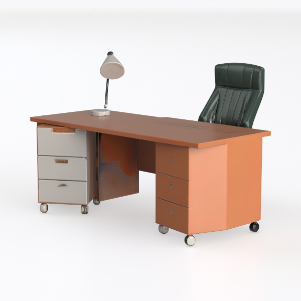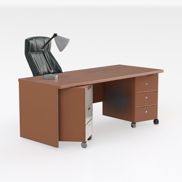 Inspired by classic workspace design, this desk blends utility and modern minimalism. Its smooth wooden surface warms the space, while the glossy leather chair adds elegance. Metallic handles and casters enhance both style and practicality. Ideal for modern/industrial studies, it pairs with a sleek desk lamp. Generous casters-equipped drawers offer easy storage, perfect for organized work or study.