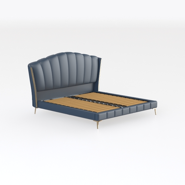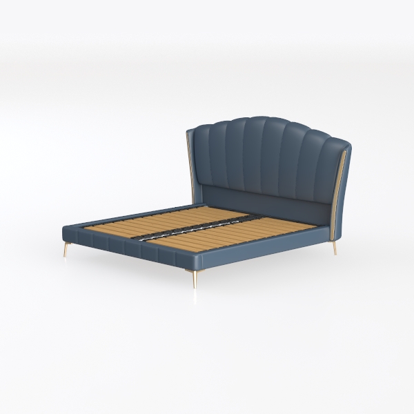 Inspired by organic curves and mid-century modern artistry, this bed features a velvety blue upholstered headboard with sculptural scalloped details. Sleek gold legs and a solid wooden slatted base enhance its soft yet sophisticated look, ideal for a modern-luxury bedroom. The contoured headboard offers excellent back support, making it both stylish and comfortable.